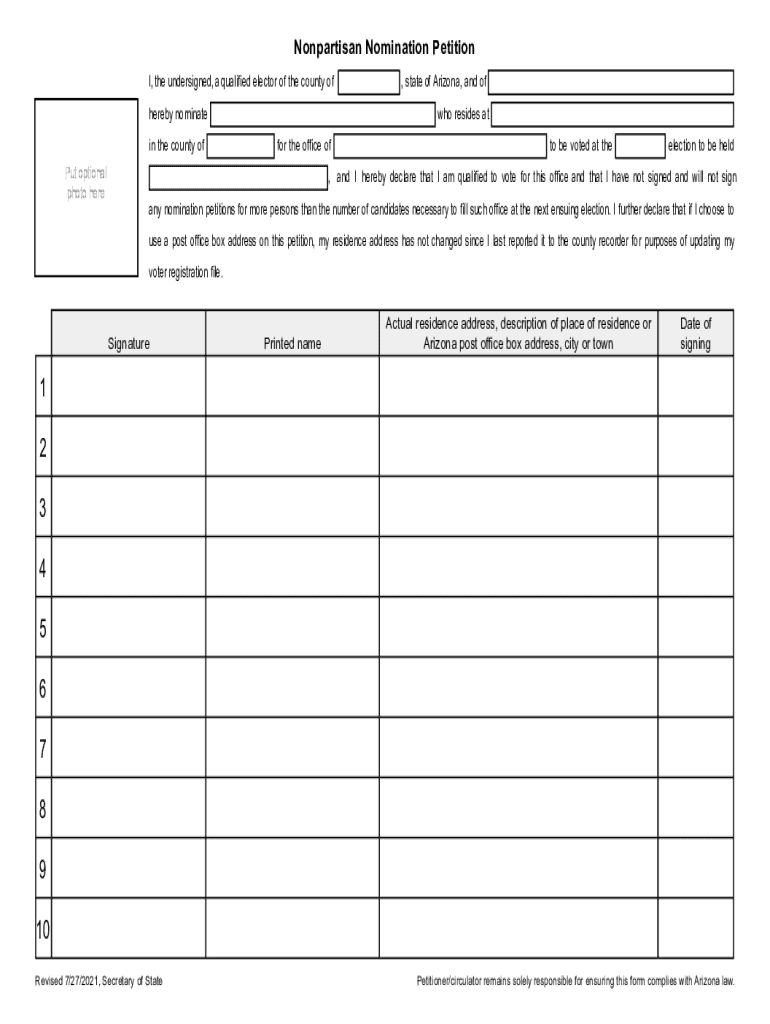 Nonpartisan Nomination Petition I, the undersigned, a qualified elector of the county of hereby nominate in the county of Put optional photo here, state of Arizona, and of who resides at for the office