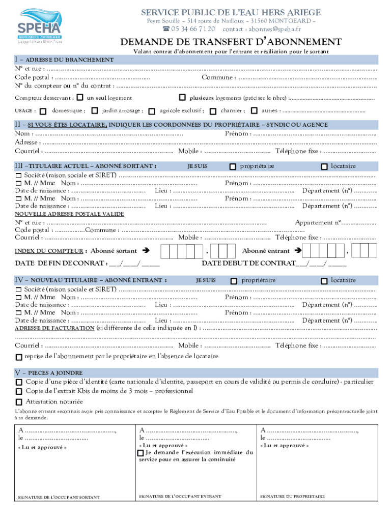 SERVICE PUBLIC DE LEAD HERS ARI EGE Pare Mouillé 514 route de Filloux 31560 MONTREAL 05 34 66 71 20contact : abonnes@speha.frDEMANDE DE TRANSFER ATONEMENT Vacant contract atonement pour entrant ET