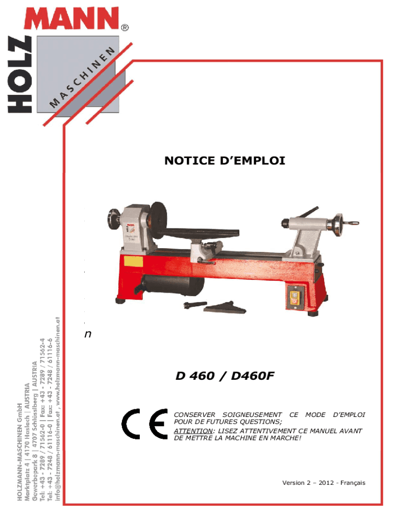 NOTICE DIPLOID r e c h s e l b a ND 460 / D460FCONSERVER SOIGNEUSEMENT CE MODE EMPLOY POUR DE FUTURES QUESTIONS; ATTENTION: LI SEZ ATTENTIVENESS CE MANUEL SAVANT DE METTLE LA MACHINE EN MARCH! Version