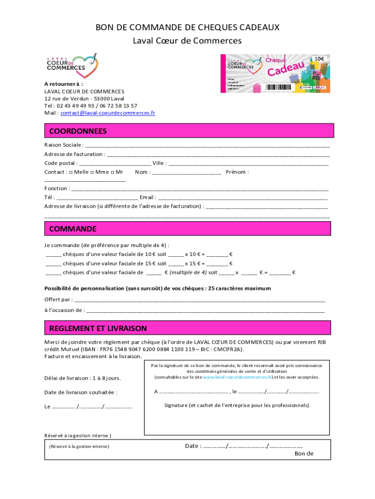 ON DE COMMAND DE Checks Châteaux Laval Cur de CommercesA returner : LAVAL COEUR DE COMMERCE 12 rue de Verdun 53000 Laval Tel : 02 43 49 49 93 / 06 72 58 13 57 Mail : contact@lavalcoeurdecommerces.frCOORDONNEES