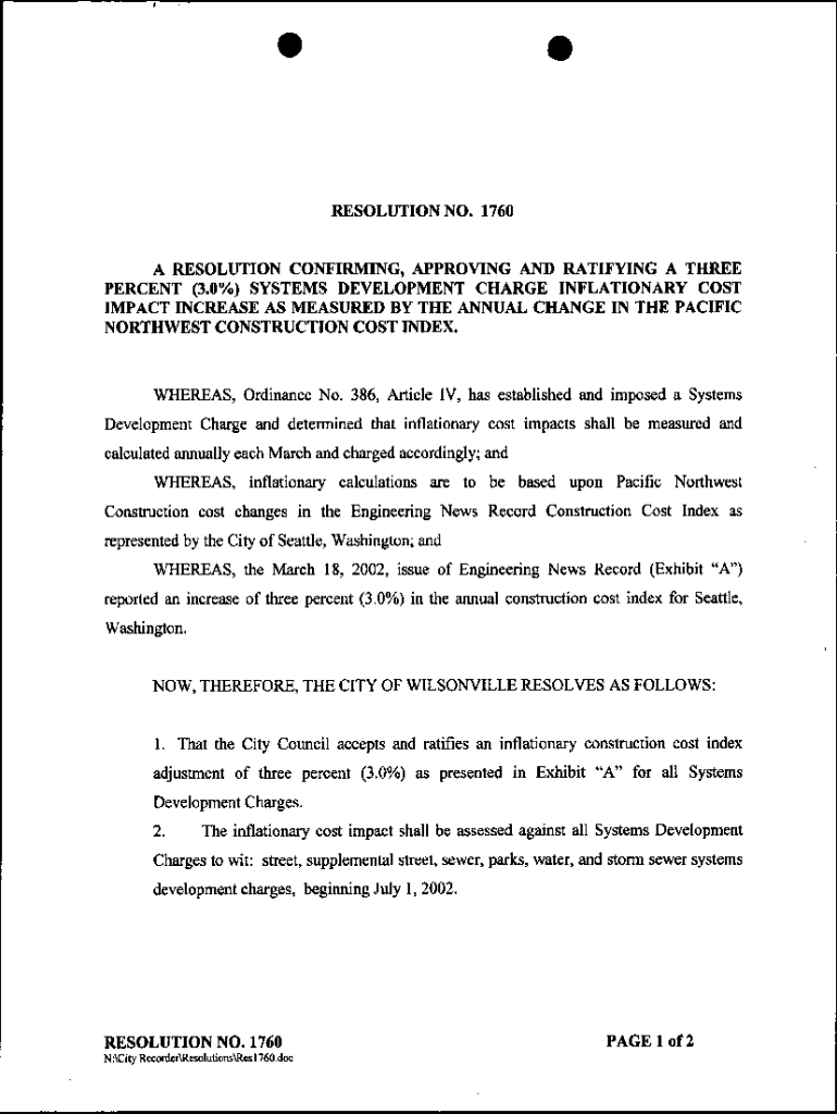 RESOLUTION NO. 1760 A RESOLUTION CONFIRMING, APPROVING AND RATIFYING A THREE PERCENT (3.0%) SYSTEMS DEVELOPMENT CHARGE INFLATIONARY COST IMPACT INCREASE AS MEASURED BY THE ANNUAL CHANGE IN THE PACIFIC