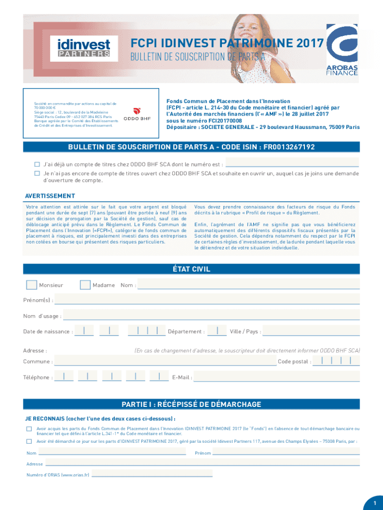 FCPI INVEST PATRIMONY 2017 BULLETIN DE SUBSCRIPTION DE PARTS Finds Common de Placement days innovation (FCPI article L. 21430 Du Code Monterey et financier) AGR par l\'Autofit DES marches financiers