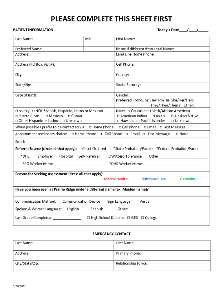PLEASE COMPLETE THIS SHEET FIRST PATIENT INFORMATIONTodays Date___/___/___Last Name:MI:First Name:Preferred Name: Address:Name if different from Legal Name: Landline Home Phone:Address (PO Box, Apt