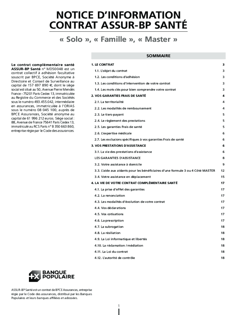 NOTICED INFORMATION CONTRACT ASSURED SENT Solo, Camille, Master SUMMARY Le contract complementary sent ASSURED Sent n MD50048 est UN contract collect if adhesion facultative Sanskrit par BPCE, So