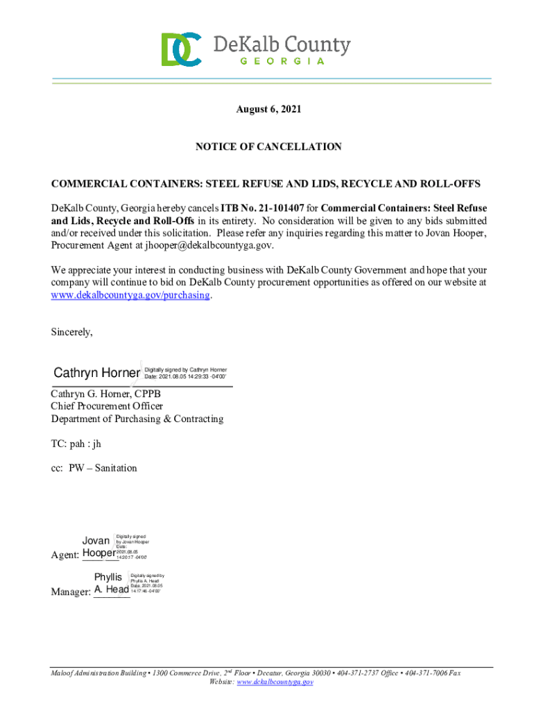 August 6, 2022, NOTICE OF CANCELLATION COMMERCIAL CONTAINERS: STEEL REFUSE AND LIDS, RECYCLE AND SELLOFFS DeKalb County, Georgia hereby cancels ITB No. 21101407 for Commercial Containers: Steel Refuse