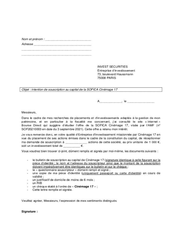 No met prom : ___ Address ___ ___ ___INVEST SECURITIES Enterprise dInvestissement 73, boulevard Hauptmann 75008 PARISObjet : intention DE subscription AU capital DE la SOFIA Image 17A___, LE ___Messieurs,