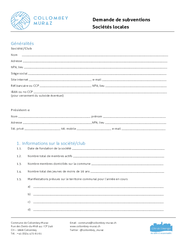 Demand DE subventions Soc its locales Grants So cit/Club Not___Address ___ NPA, lieu ___ Side social ___ Site internet ___ email ___ Rf. Fancier of CCP ___ NPA, lieu ___ IBAN of no CCP ___ (pour vehement