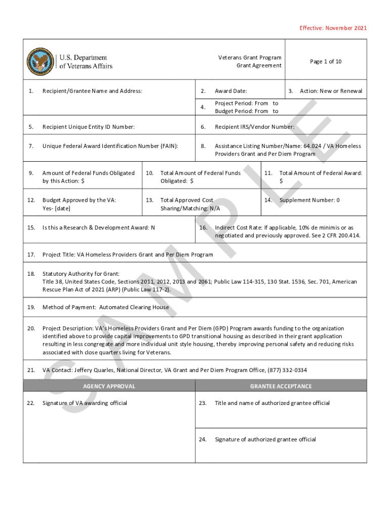 Effective: November 2021Veterans Grant Program Grant Agreement1. Recipient/Grantee Name and Address:2. Award Date:4. Project Period: From to Budget Period: From to Page 1 of 103. Action: New or RenewalRecipient