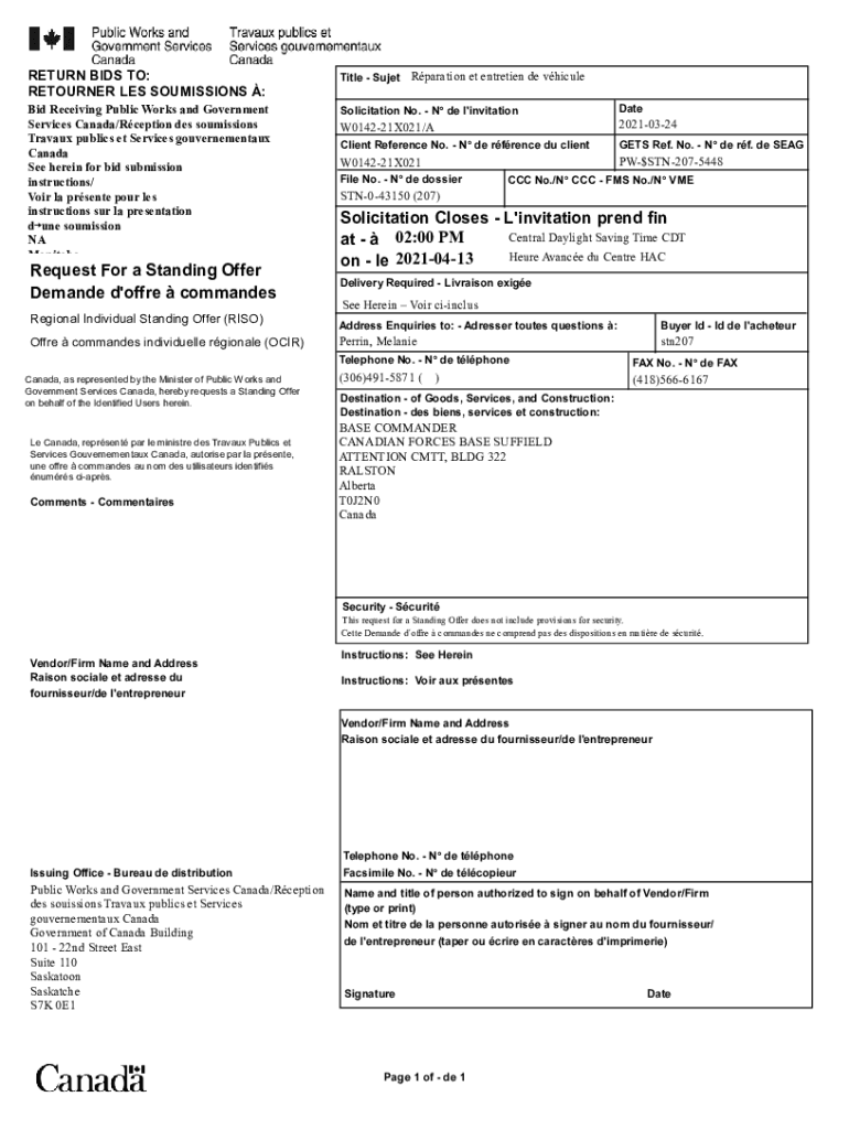 11RETURN BIDS TO: RETURNER LES COMMISSIONS :Title Suet Reparation ET entertain de vhiculeBid Receiving Public Works and Government Services Canada/Reception DES sou missions Travail public set Services