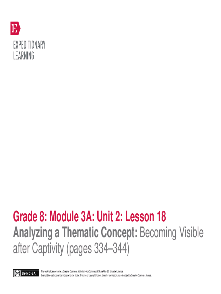 Grade 8: Module 3A: Unit 2: Lesson 18 Analyzing a Thematic Concept: Becoming Visible after Captivity (pages 334344) This work is licensed under a Creative Commons AttributionNonCommercialShareAlike
