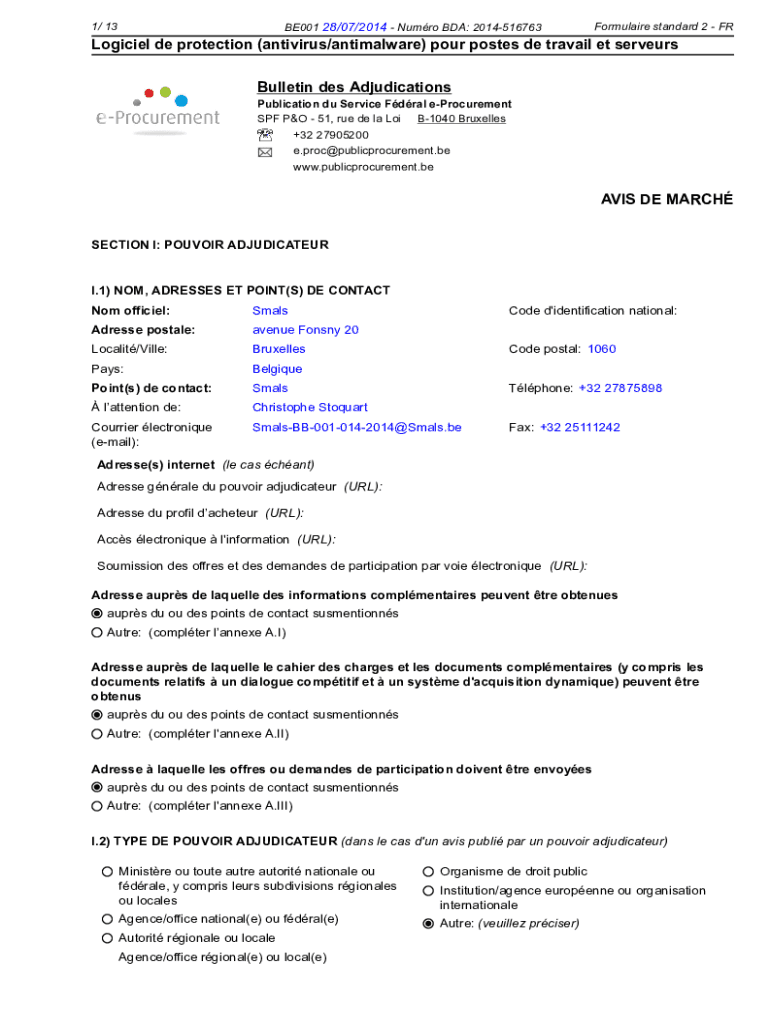 BE001 28/07/2014 Humor BDA: 20145167631/ 13Formulaire standard 2 FRLogiciel de protection (antivirus/antimalware) pour posts DE travail ET servers Bulletin DES AdjudicationsPublication du Service