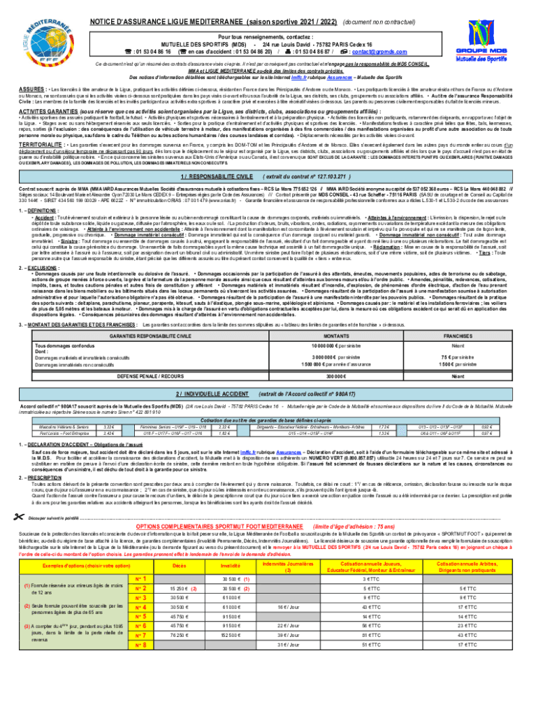NOTICED ASSURANCE LI GUE MEDITERRANEAN (Saigon sportive 2021 / 2022) (document non-contractual) Pour thus restatements, contacted : MUTUALLY DES SPORT IFS (MDS) 2/4 rue Louis David 75782 PARIS CEDEX