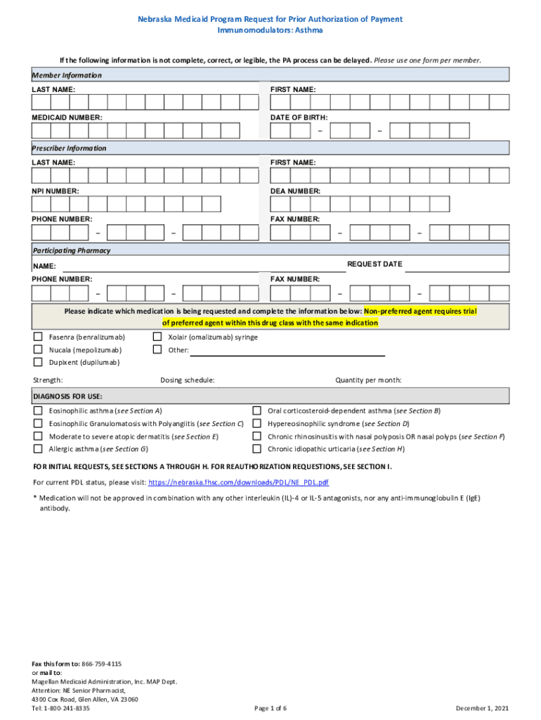 Nebraska Medicaid Program Request for Prior Authorization of Payment Immunomodulators: Asthma If the following information is not complete, correct, or legible, the PA process can be delayed. Please