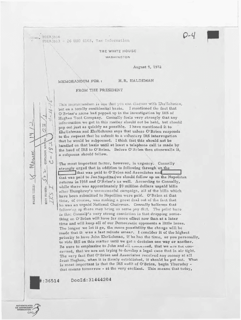 FOIA(b)6 FOIA(b)3 26 USC 6103, Tax Information. TH E WHIT!:: HOUSE WASHING GT ON Aug must 9, 1972MEMORANDUM FOR:!ROMAN. R. HALDEMANTHE PRESIDE ENT! \'\': This mmolanthtrn i on that i\'of can DJ:;cut