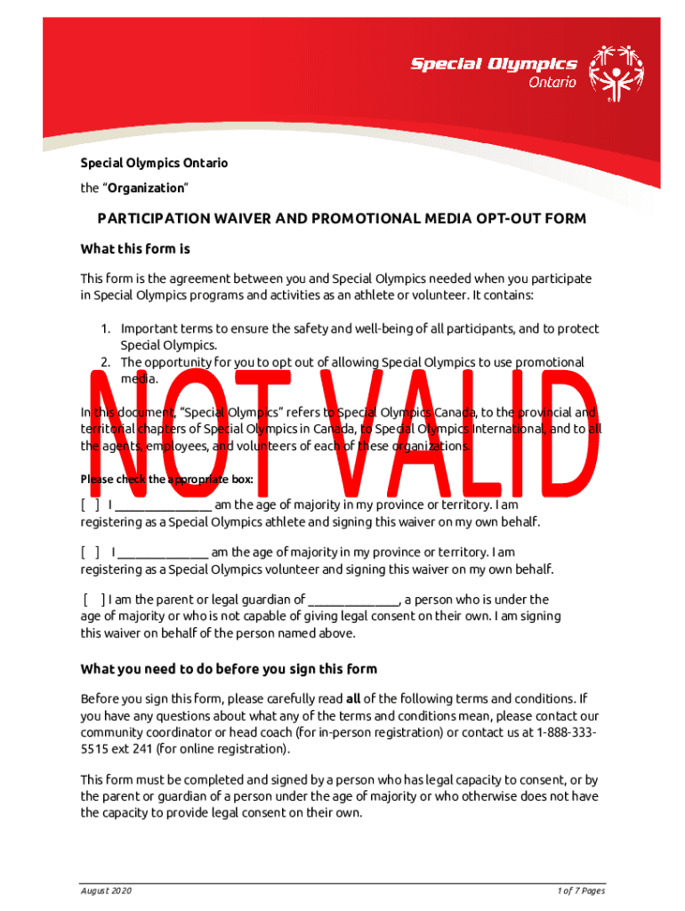 Special Olympics Ontario the OrganizationPARTICIPATION WAIVER AND PROMOTIONAL MEDIA OPT-OUT FORM What this form is This form is the agreement between you and Special Olympics needed when you participate