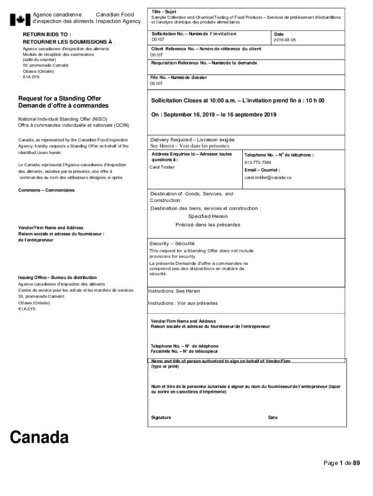 Agency Canadian Food inspection DES aliments Inspection Agency RETURN BIDS TO : RETURNER LES COMMISSIONS : Agency Canadian inspection DES aliments Module DE reception DES sou missions (sale Du courier)