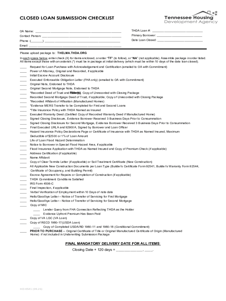 CLOSED LOAN SUBMISSION CHECKLIST OA Name: ___THEA Loan #: ___Contact Person: ___Primary Borrower: ___Phone :(___) ___Date Loan Closed: ___Email: ___ Please upload package to: THELMA.THEA.ORG In each
