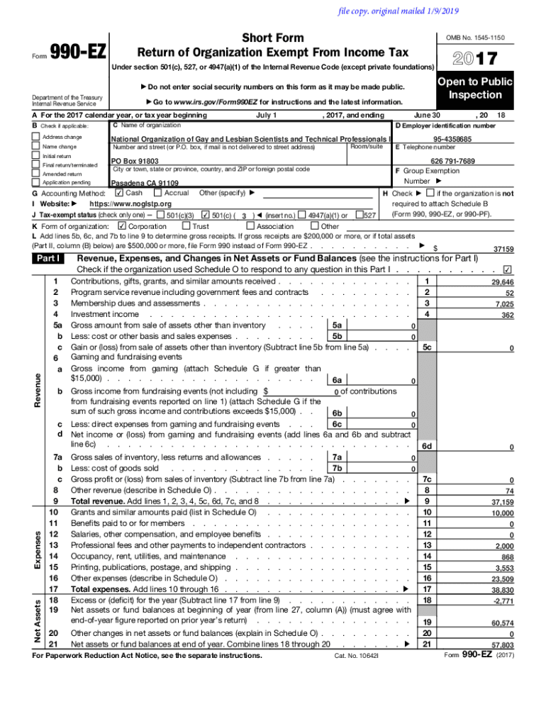 File copy. Original mailed 1/9/2019Form990EZShort Form Return of Organization Exempt From Income Tax Under section 501(c), 527, or 4947(a)(1) of the Internal Revenue Code (except private foundations)