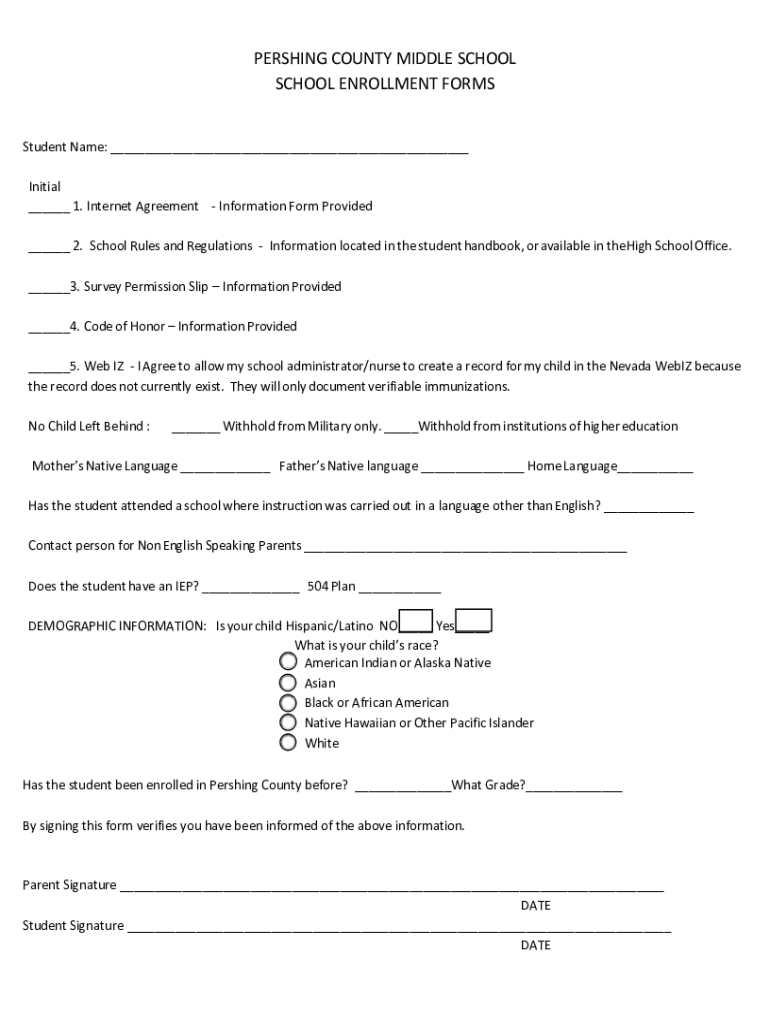PERSHING COUNTY MIDDLE SCHOOL ENROLLMENT FORMSStudent Name: ___ Initial ___ 1. Internet Agreement Information Form Provided ___ 2. School Rules and Regulations Information located in the student handbook,