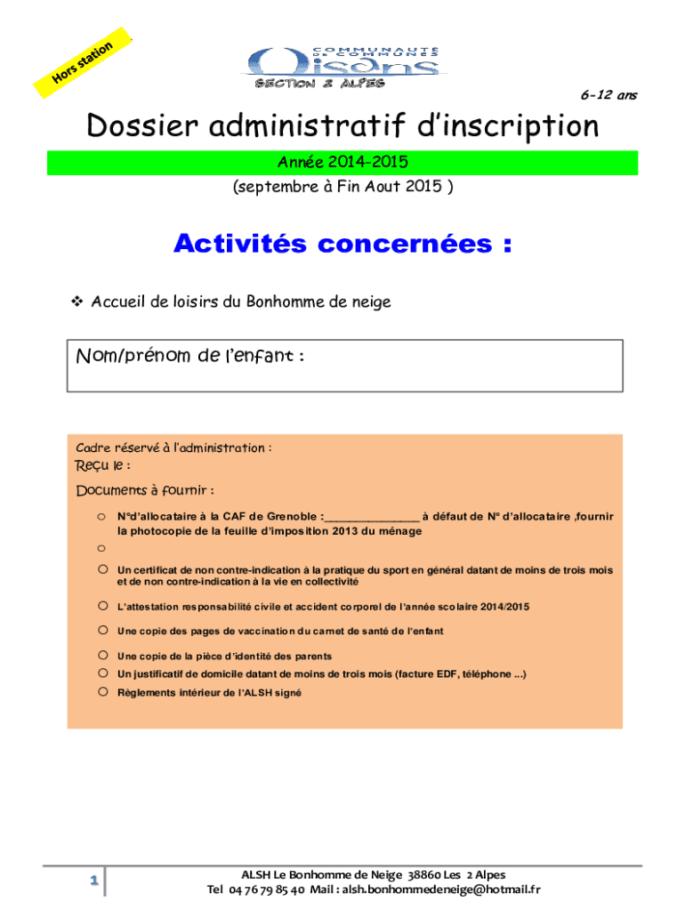 Section 2 Alpes612 dossier administration inscription Anne 20142015 (September Fin About 2015)Activity concerns : Actual DE losers Du Bonhomme de neighbor/prom DE Enfant :Cadre serve administration