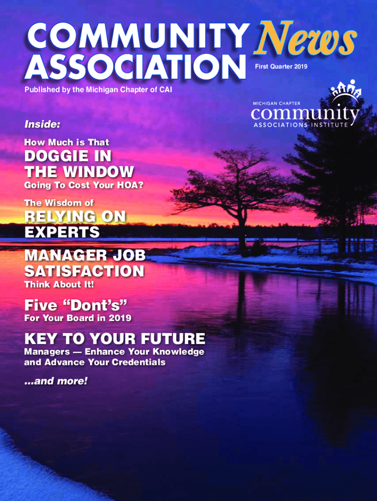 COMMUNITY News ASSOCIATION First Quarter 2019Published by the Michigan Chapter of Inside: How Much is ThatDOGGIE IN THE Windowing To Cost Your HOA? The Wisdom relying ON EXPERTS MANAGER JOB SATISFACTION