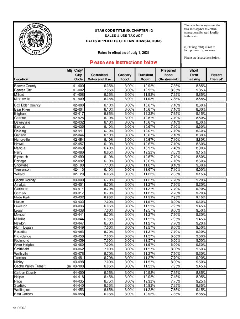 The rates below represent the total rate applied to certain transactions for each locality in the state. UTAH CODE TITLE 59, CHAPTER 12 SALES & USE TAX ACT RATES APPLIED TO CERTAIN TRANSACTIONS(a)