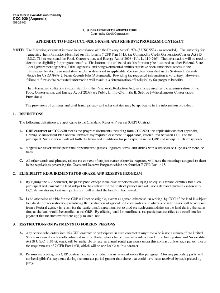 This form is available electronically.CCC920 (Appendix) (082509) U. S. DEPARTMENT OF AGRICULTURE Commodity Credit CorporationAPPENDIX TO FORM CCC920, GRASSLAND RESERVE PROGRAM CONTRACT NOTE: The following