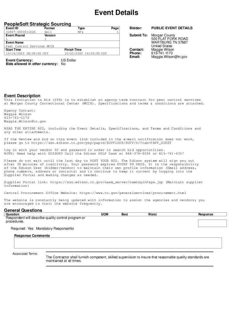 Event Details People Soft Strategic Sourcing Event ID Format 329470000011626 Sell Event Round Version 1 1 Event Name Pest Control Services CCX Start Time 10/16/2020 08:00:00 Type Rampage 1Bidder:PUBLIC