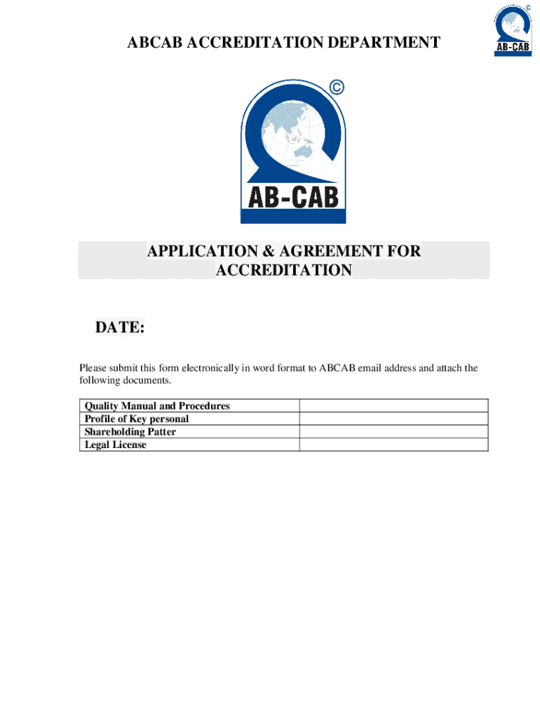 AB CAB ACCREDITATION DEPARTMENTALIZATION & AGREEMENT FOR ACCREDITATIONDATE: Please submit this form electronically in word format to AB CAB email address and attach the following documents. Quality