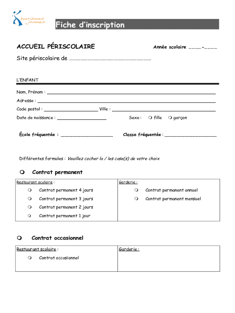 Fiche d'inscription periscolaire et can be filled out online or in person by providing the required information and signatures.