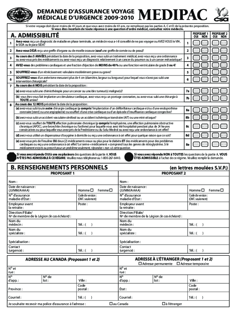 DEMANDED ASSURANCE VOYAGE MEDICAL URGENCY 20092010medipacSi vote voyage dot Durer coins DE 41 hours et Que vows ave coins DE 61 ans, né remplissez pas less parties A, C et D de la present proposition.