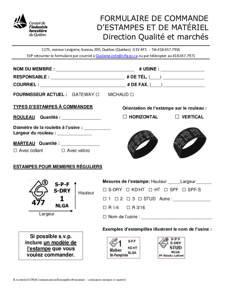 FORMULA IRE DE COMMAND RESTAMPED ET DE MATERIEL Direction Quality ET marches 1175, avenue Lingerie, bureau 200, Quebec (Quebec) G1V 4P1 Tl.418.657.7916 SVP returner LE formula ire par courier Guylaine.cote@cifq.qc.ca