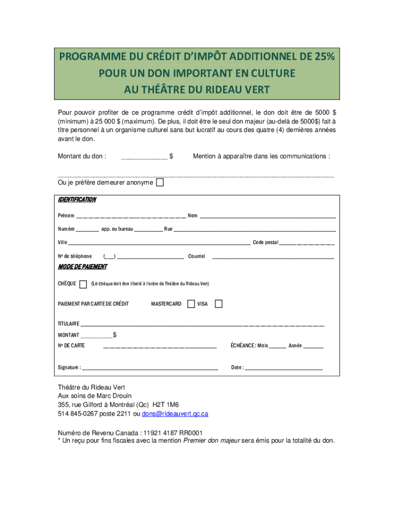 Program DU CREDIT DI MPT ADDITIONAL DE 25% POUR UN DON IMPORTANT EN CULTURE AU THERE DU RID EAU VERT Pour boudoir profited de CE program credit dim pt additional, LE don dot TRE de $5000 (minimum)