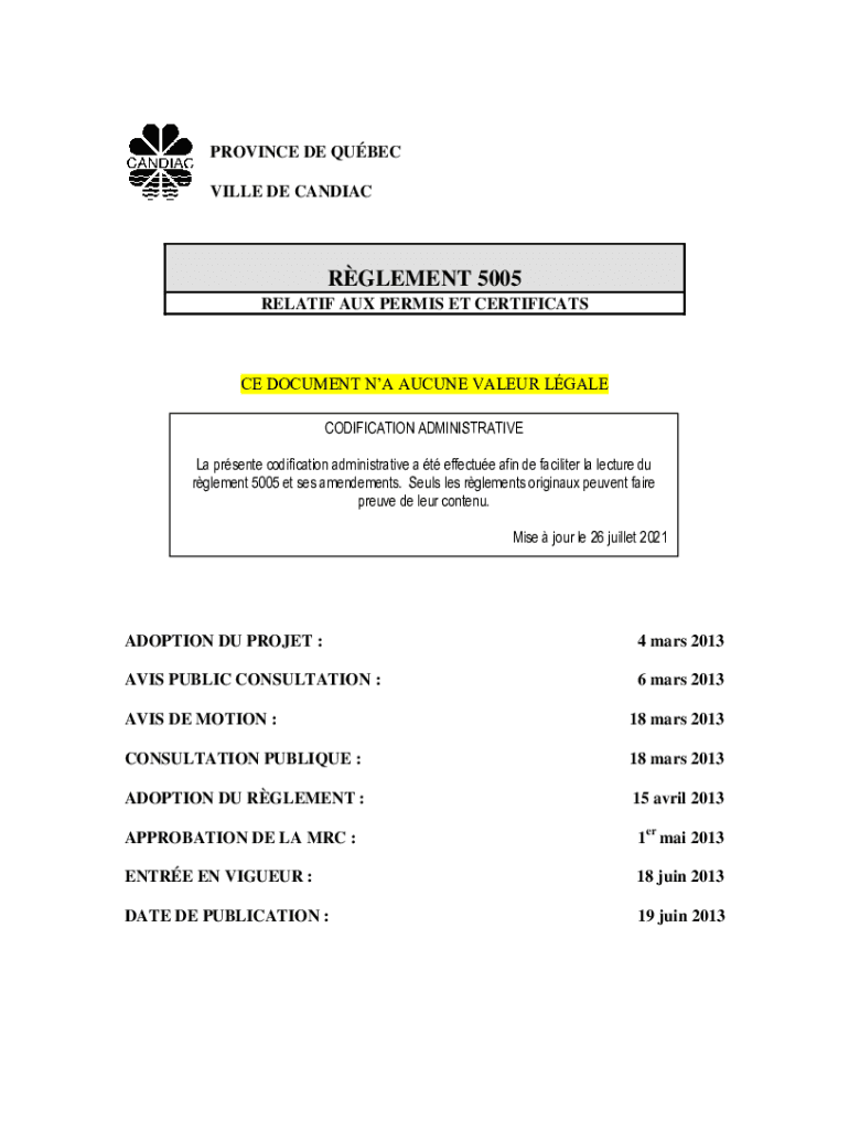 PROVINCE DE QUEBEC VILLA DE CANDIACRGLEMENT 5005 RELATED AUX PERMIT ET CERTIFICATE DOCUMENT NA ACUTE VAL EUR GALE CODIFICATION ADMINISTRATIVE La present codification administrative a t effect akin