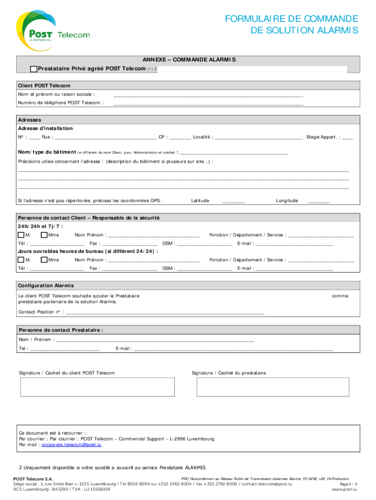 FORMULA IRE DE COMMAND DE SOLUTION ALARMS ANNEXED COMMAND ALARMS Prestate PRI AGR POST Telecom(*): ___Client POST Telecom No met prom of raisin social :___Humor DE phone POST Telecom :___Addresses
