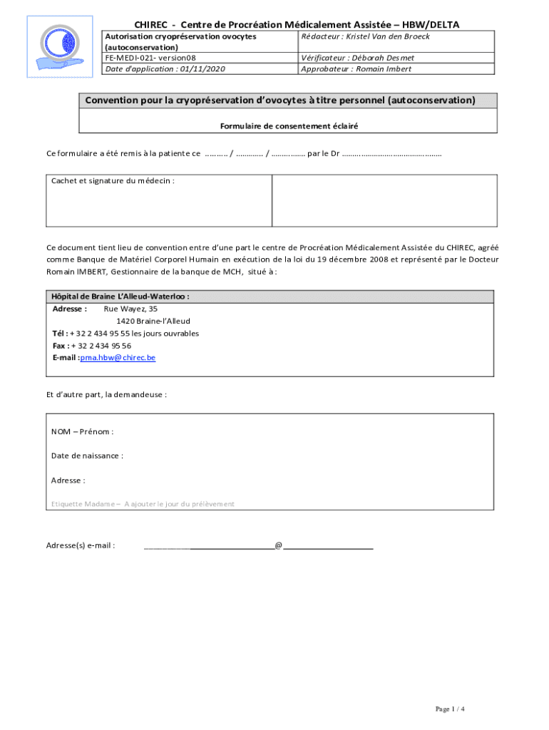 CH IREC Center de Procration Disablement Assist HOW/DELTA Authorization cryoprservation oocytes (autoconservation) FEMEDI021 version08 Date d\'application : 01/11/2020Rdacteur : Kristen Van den Brock
