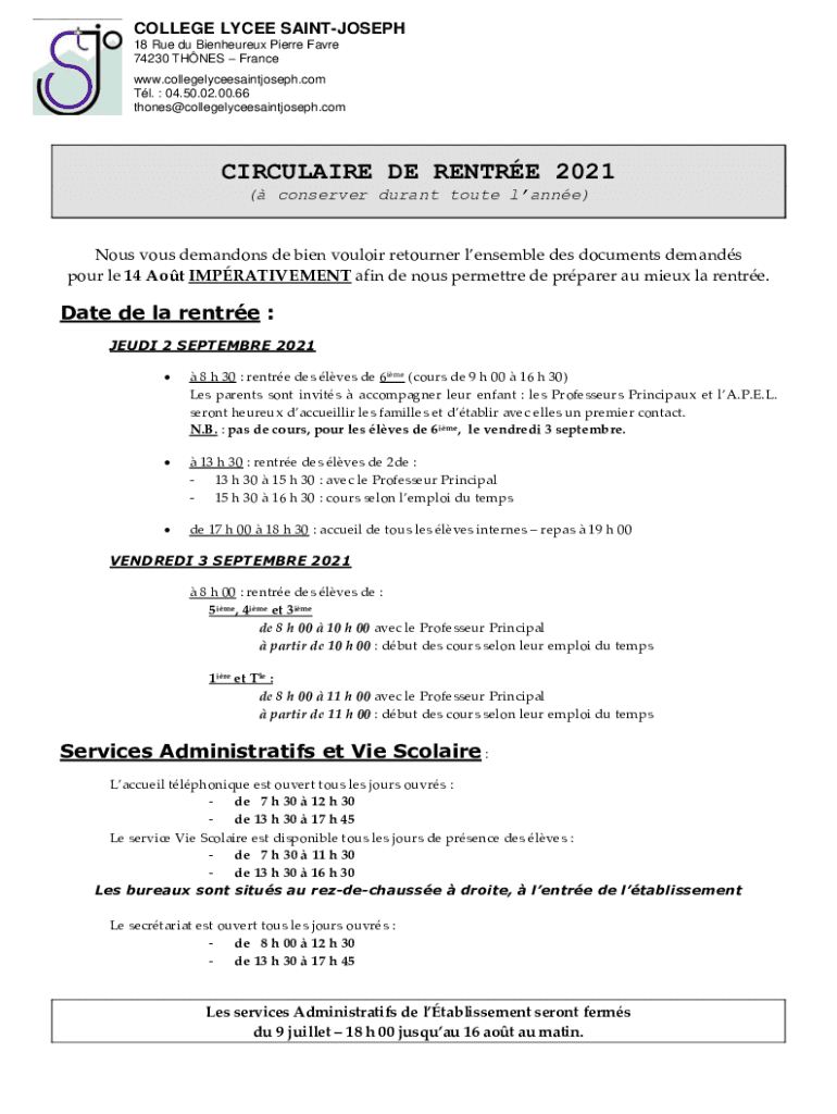 COLLEGE LYCÉE SAINTJOSEPH 18 Rue du Bienheureux Pierre Favre 74230 TONES France www.collegelyceesaintjoseph.com Tl. 04.50.02.00.66 thones@collegelyceesaintjoseph.comCIRCULAIRE DE RENT RE 2021 (conserved