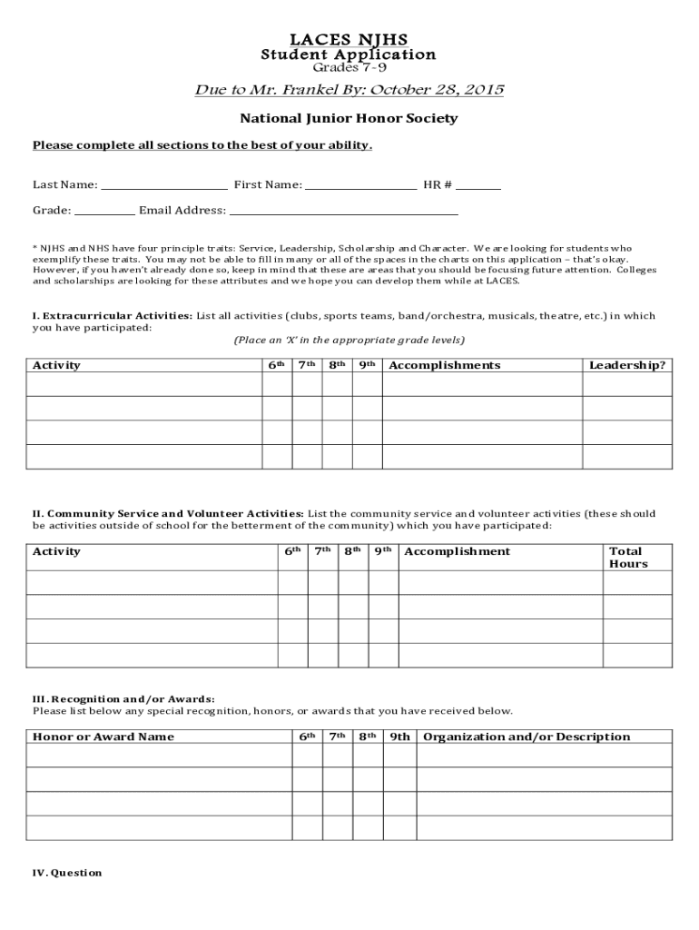 LACES NHS Student Application Grades 79Due to Mr. Frankel By: October 28, 2015NationalJuniorHonorSociety Pleasecompleteallsectionstothebestofyourability. Hostname:___Filename:___HR#___ Grade:___Misaddress:___*NJHSandNHShavefourprincipletraits:Service,