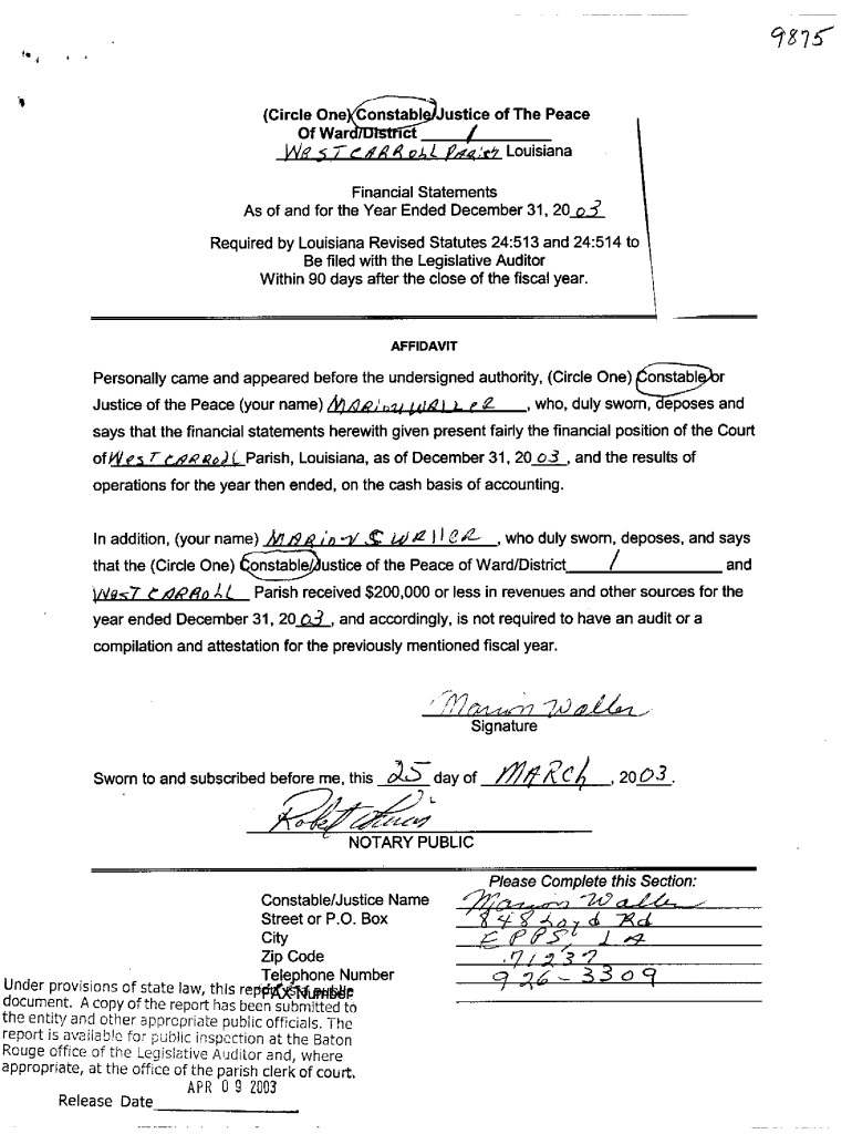 An FFI DAV Impersonally cam e and Justice of the Peace says that the f inancialstatem ends here with given present fairly the f inancialposition of the Court of/A/, 7_., \') L Parish, Louisiana, aside