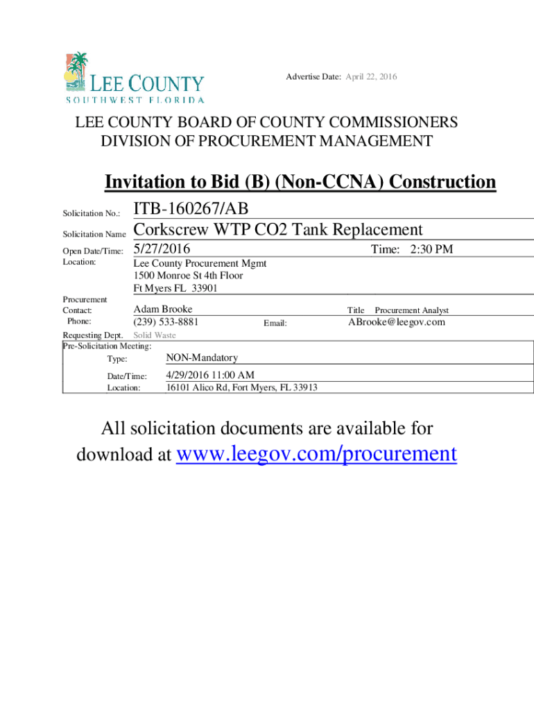 Advertise Date: April 22, 2016LEE COUNTY BOARD OF COUNTY COMMISSIONERS DIVISION OF PROCUREMENT MANAGEMENTInvitation to Bid (B) (NonCCNA) Construction Solicitation No.: Solicitation Name Open Date/Time: