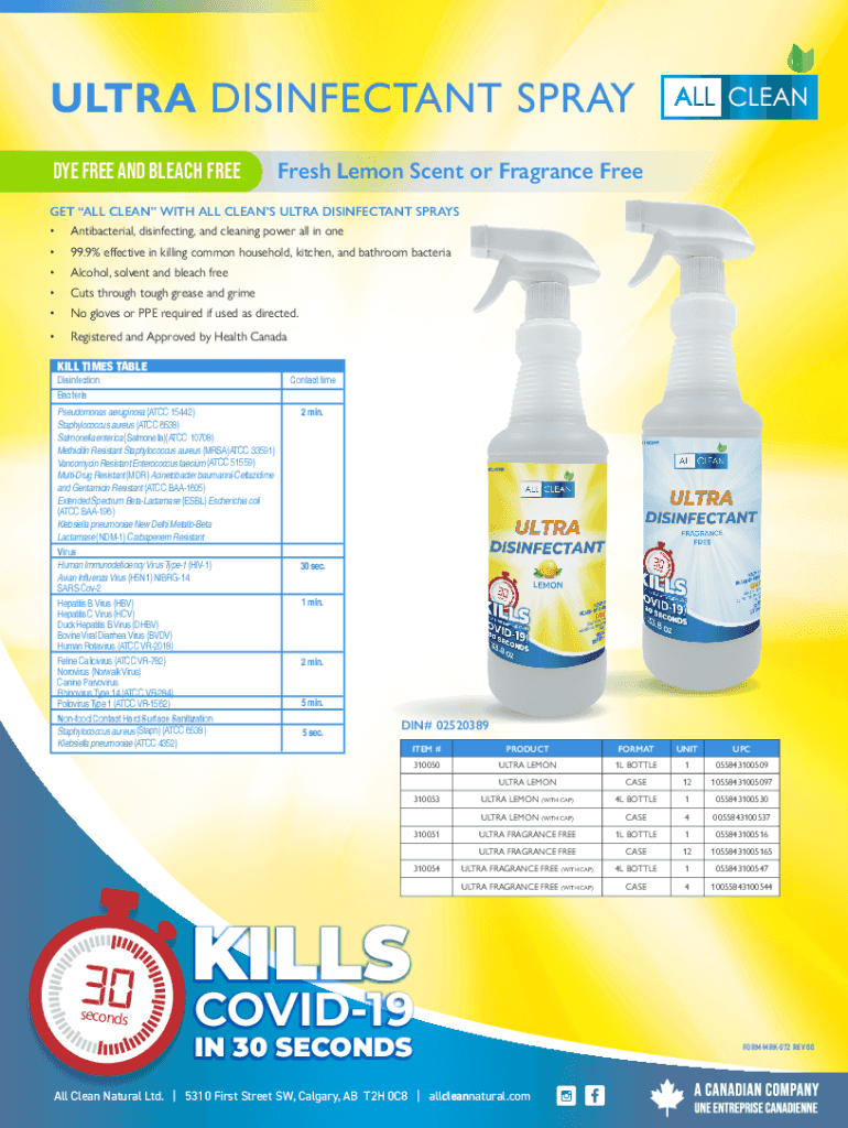 ULTRA DISINFECTANT SPRAY DYE FREE AND BLEACH Refresh Lemon Scent or Fragrance Free Gets ALL CLEAN WITH ALL CLEANS ULTRA DISINFECTANT SPRAYS Antibacterial, disinfecting, and cleaning power all in one