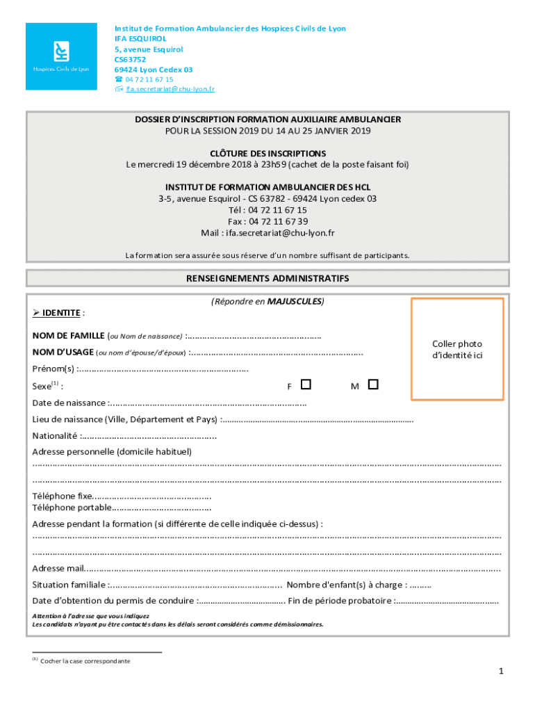 Institute DE Formation Ambulance DES Hospices Civil de Lyon IFA ESQUIRE 5, avenue Esquire CS63752 69424 Lyon CEDEX 03 04 72 11 67 15 ifa.secretariat@chulyon.frDOSSIER INSCRIPTION FORMATION AUXILIARY