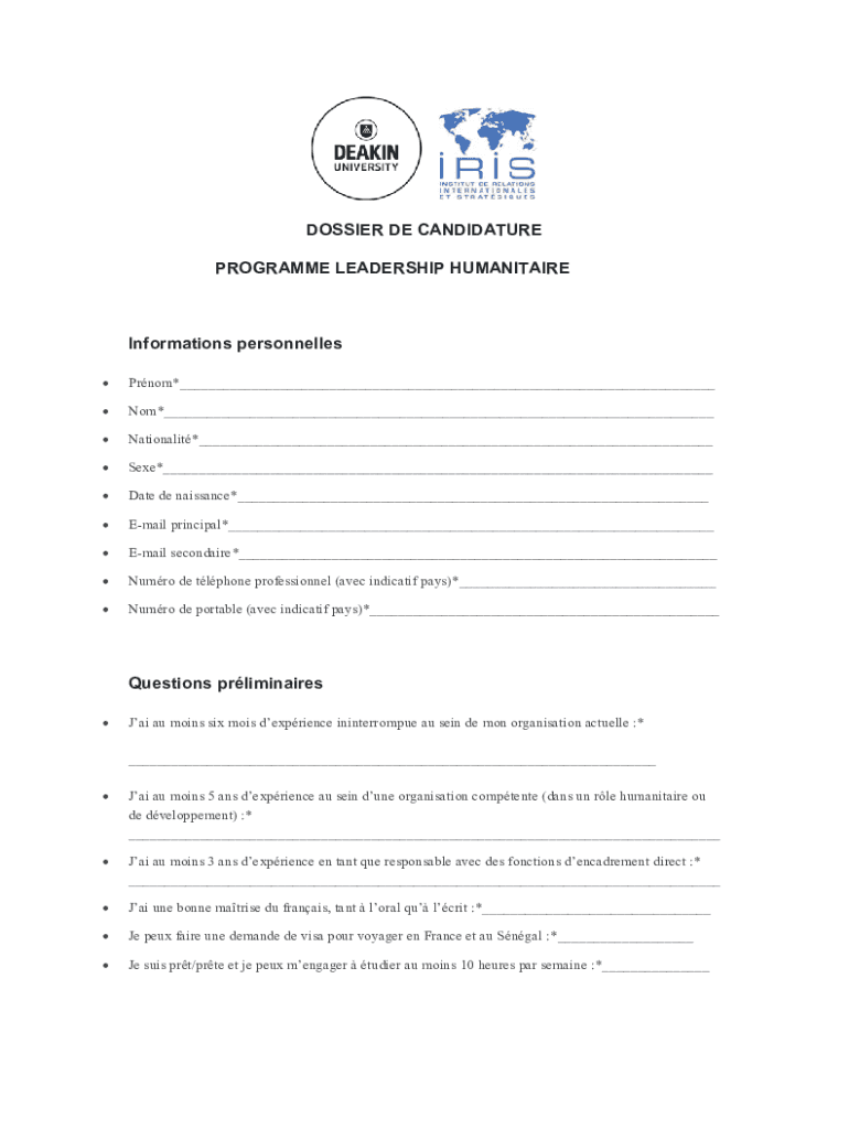 DOSSIER DE CANDIDATURE Program LEADERSHIP HUMANITAIREInformations personnel Prom*___Not*___Nationalist*___See*___Date de Renaissance*___Email principal*___Email secondary*___Humor DE phone professional