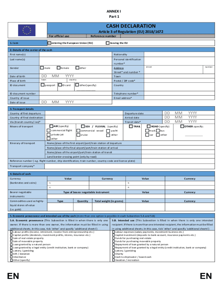 ANNEX I Part 1CASH DECLARATION Article 3 of Regulation (EU) 2018/1672 For official use 1. I reference number entering the European Union (EU)leaving the EU2. Details of the carrier of the cash First