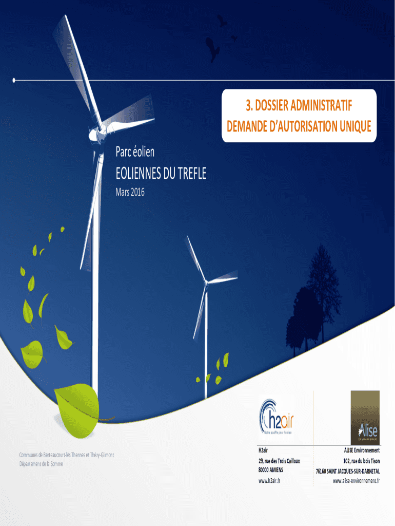 3. DOSSIER ADMINISTRATION DEMAND AUTHORIZATION UNIQUE PARC olienEOLIENNES DU TREBLE Mars 2016Communes de Berteaucourtls Tennis et ThzyGlimont Department de la Somme1ETUDE DIMPACTH2air 29, rue DES