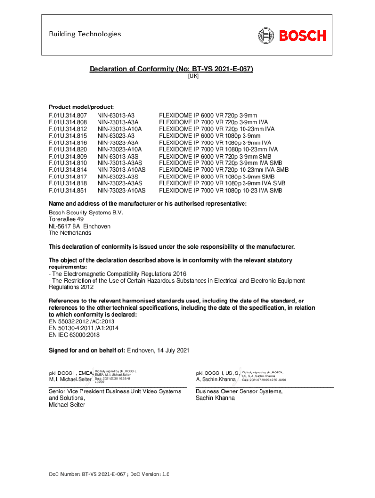 Building TechnologiesDeclaration of Conformity (No: TVs 2021E067) [UK]Product model/product: F.01U.314.807 NIN63013A3 F.01U.314.808 NIN73013A3A F.01U.314.812 NIN73013A10A F.01U.314.815 NIN63023A3