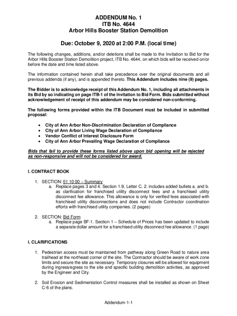ADDENDUM No. 1 ITB No. 4644 Arbor Hills Booster Station Demolition Due: October 9, 2020, at 2:00 P.M. (local time) The following changes, additions, and/or deletions shall be made to the Invitation