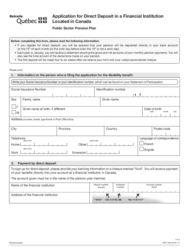 Application for Direct Deposit in a Financial Institution Located in Canada Public Sector Pension PlanBefore completing this form, please read the following information: If you register for direct