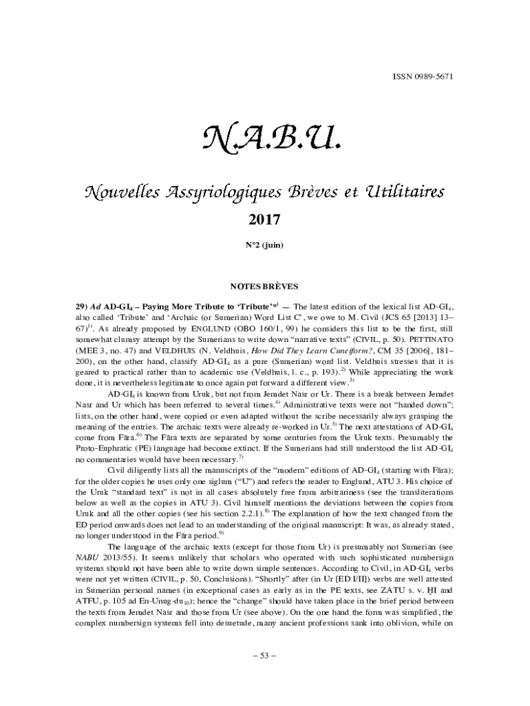 ISSN 098956712017 N2 (join)NOTES BRAVES 29) Ad ADGI4 Paying More Tribute to Tribute*) The latest edition of the lexical list ADGI4, also called Tribute and Archaic (or Sumerian) Word List C, we owe