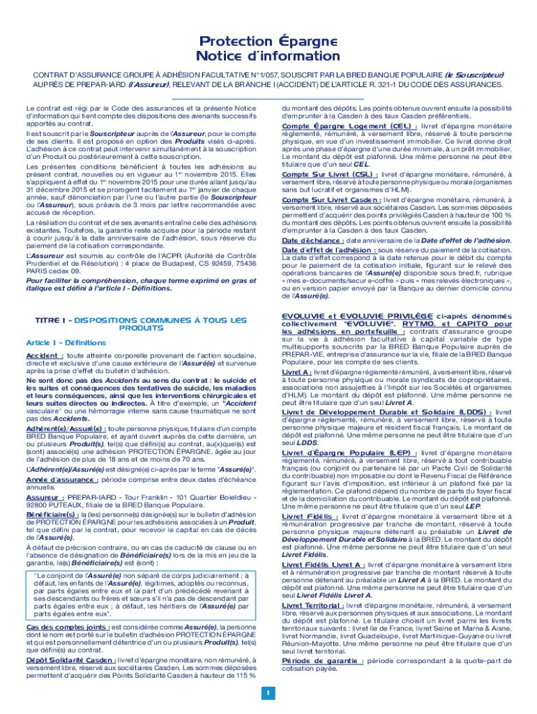 Protection large Noticed information CONTRACT ASSURANCE GROUP ADHESION FACULTATIVE N1/057, SANSKRIT PAR LA BRED BANQUET POPULAR (LE Souscripteur) APRS DE PREPARED (assurer), RELEVANT DE LA BRANCH